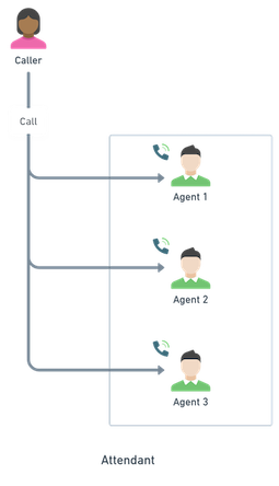 - Attendant: If an agent is available, the call will ring simultaneously on all agents terminals (Agent Console, Teams client).