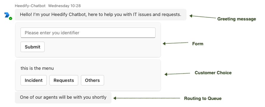- Chatbot will reply according to configured routing on the Chatflow. Here we have a greeting, form to get user information, a multi-choice card to get needed service, then user will be redirected to channel.