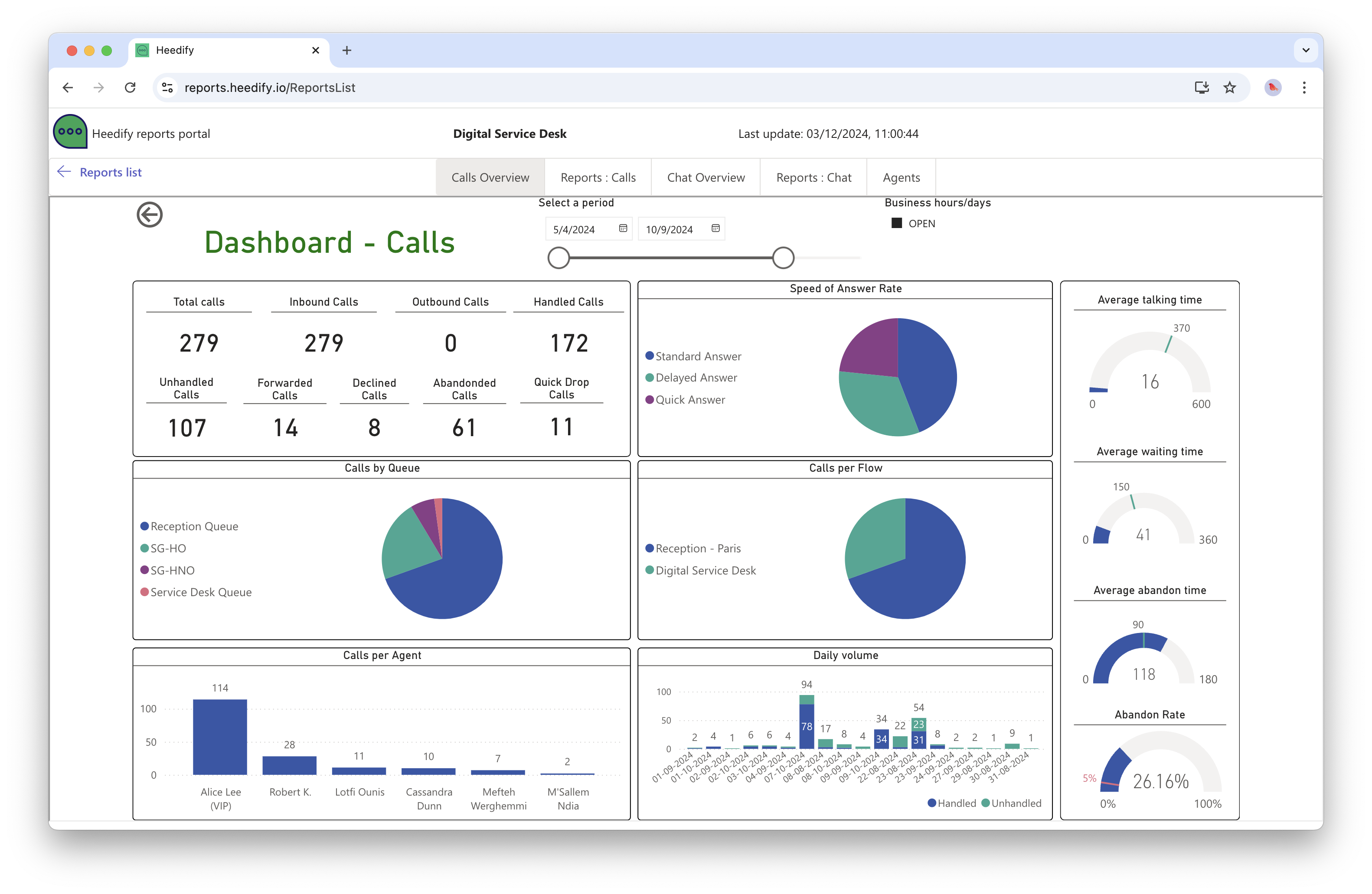 The Heedify Reports Portal provides a comprehensive overview of key performance metrics, enabling users to analyze and evaluate operational efficiency and customer engagement. It includes a wide range of insights, from overall call and chat statistics to detailed breakdowns of agent performance and response times.