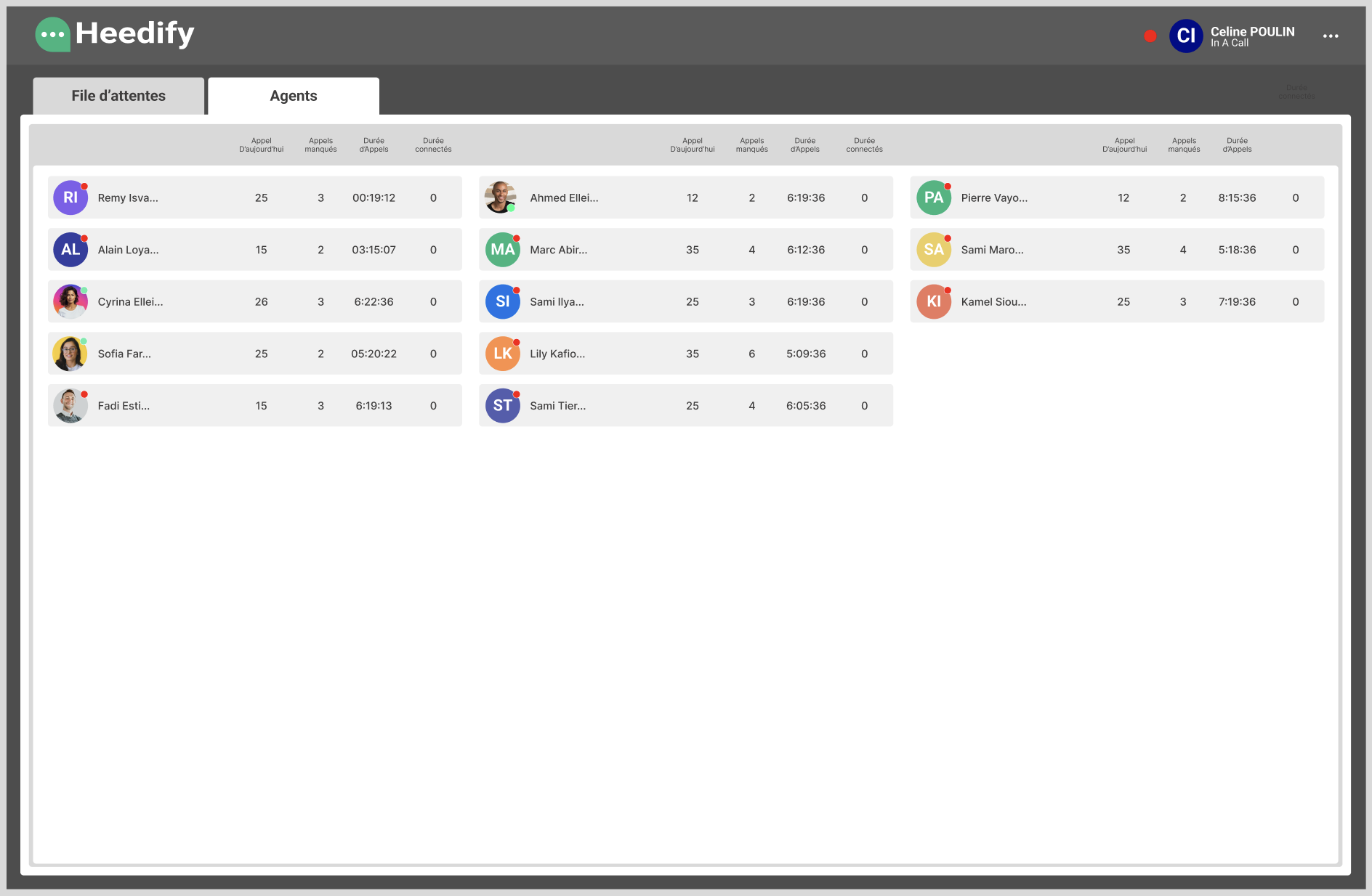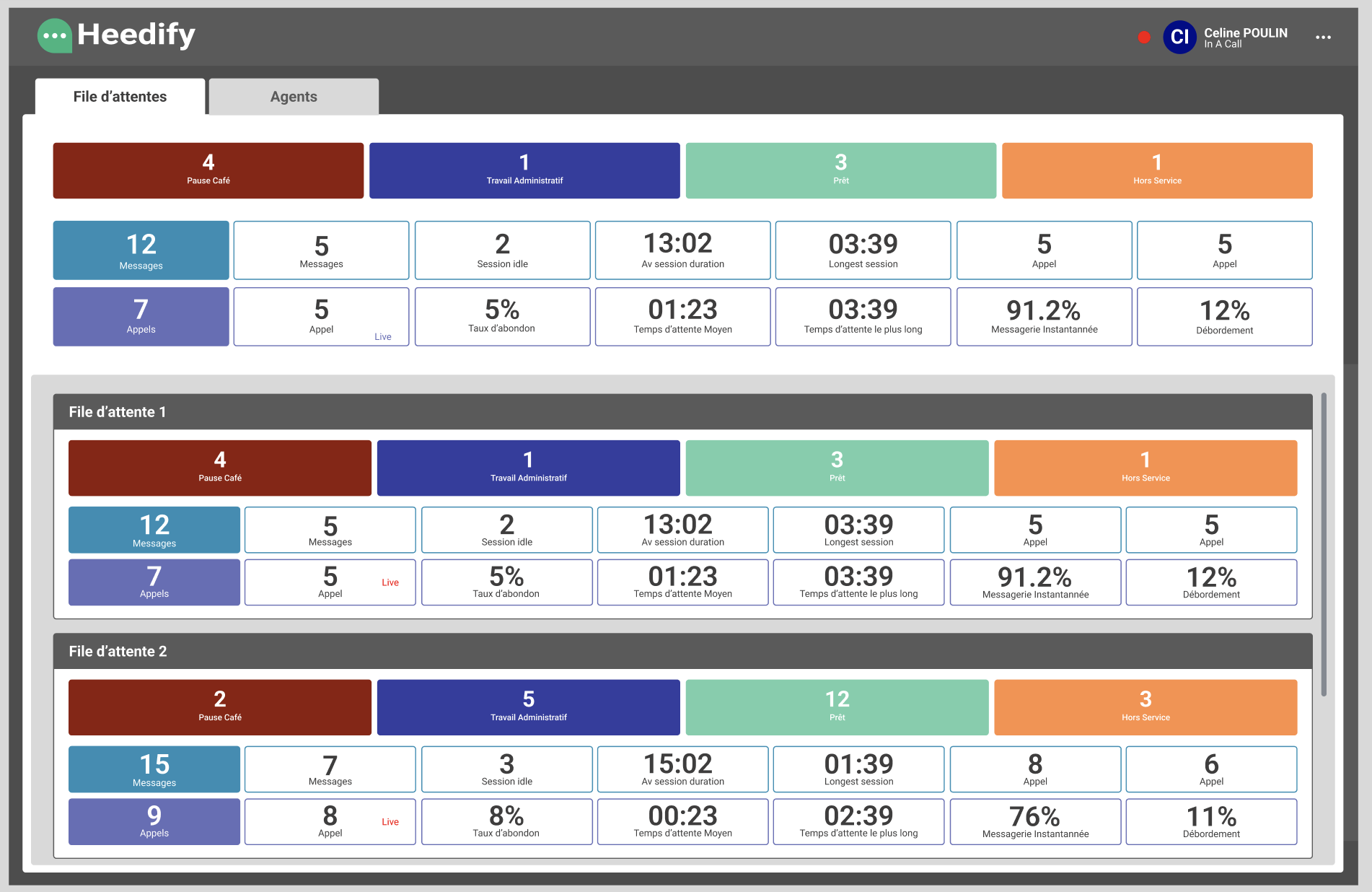The Heedify Wallboard is a real-time monitoring dashboard designed to provide key performance metrics and insights for service queues and agents activities. It is organized into two main tabs: one for monitoring service queues and another for tracking agent performance.